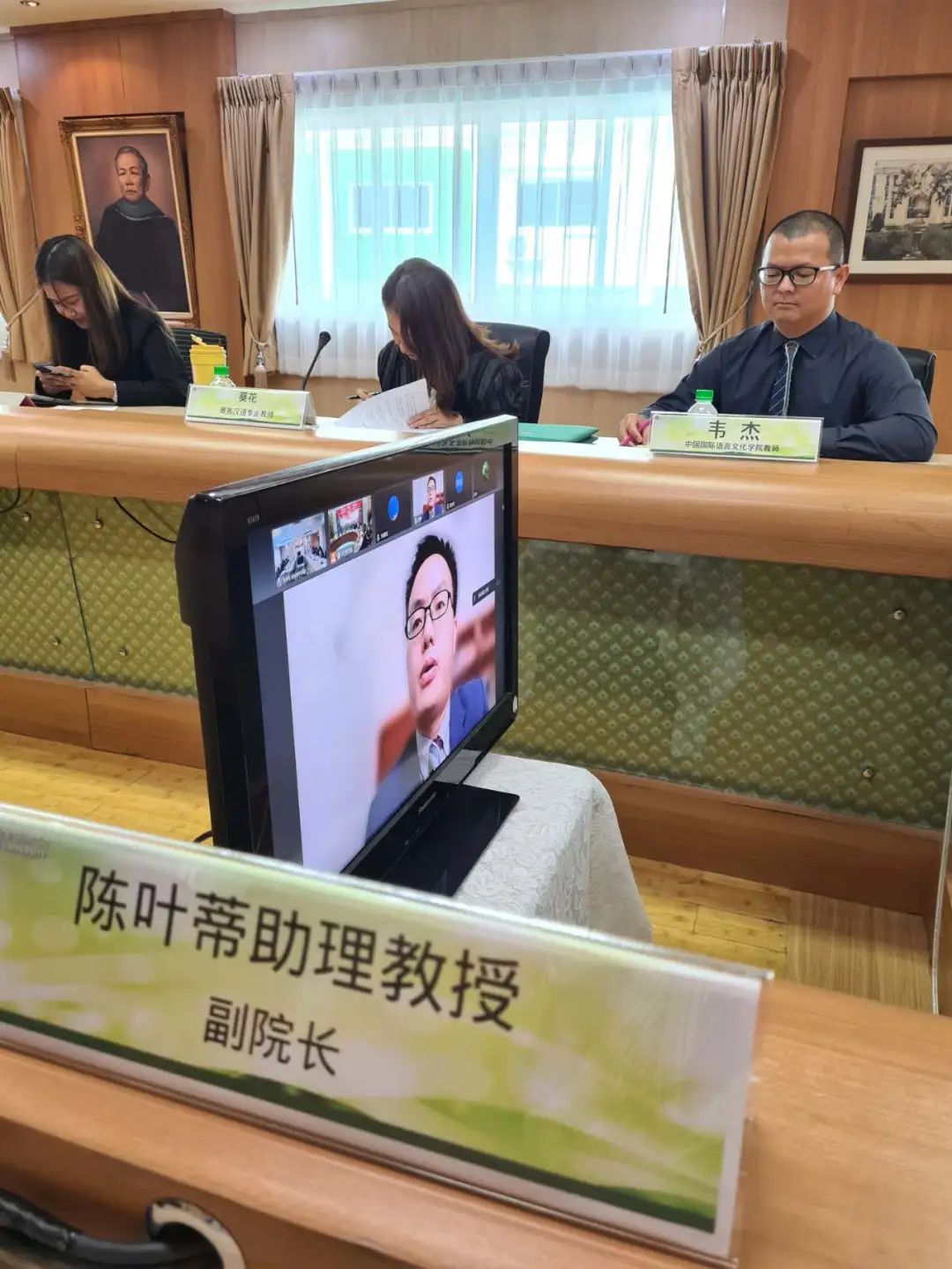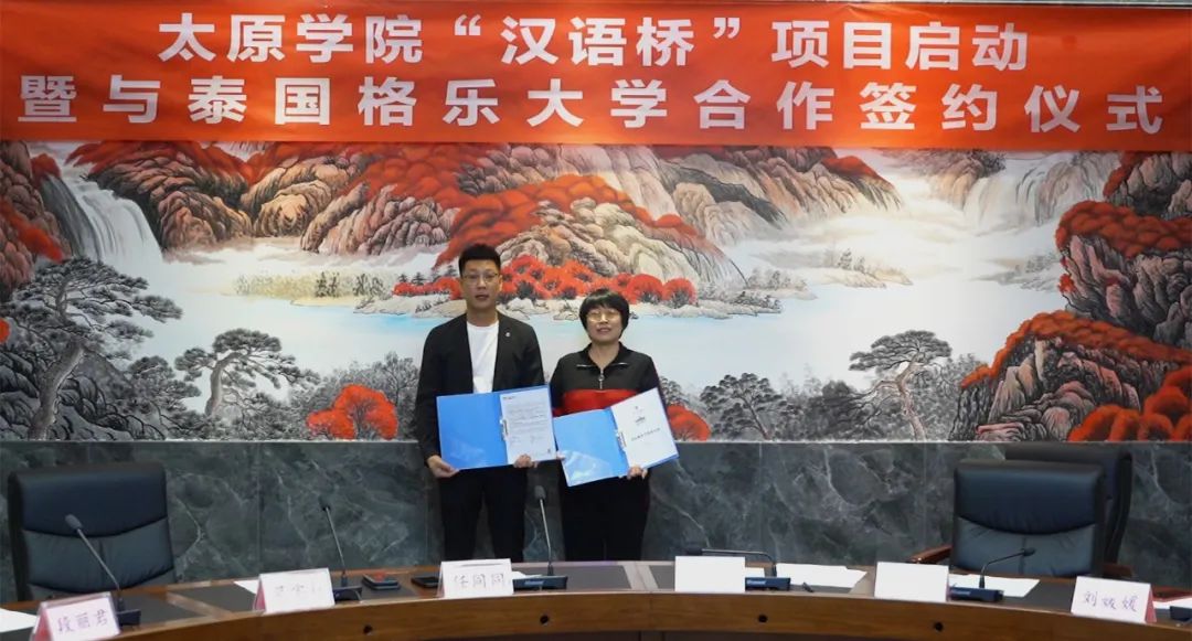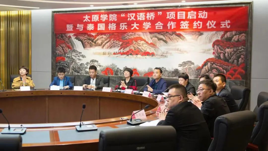2023年3月31日上午,泰国格乐大学与太原学院合作签约仪式暨太原学院“汉语桥”项目启动仪式在太原学院进行。泰国格乐大学素帕副校长、中国国际语言文化学院罗勇院长及太原学院刘月红副院长出席并致辞。会上素帕副校长和刘月红副院长代表两校签署了合作备忘录。此次会议由太原学院文化与旅游系主任刘媛媛教授主持,太原学院院办主任、国际合作交流处处长忽江华、外语系主任李文洁、格乐大学山西服务中心主任任同同出席会议。参加会议的还有文旅系党政班子成员、汉语桥项目团队教师,格乐大学山西服务中心葛宪柱、段丽君等嘉宾。