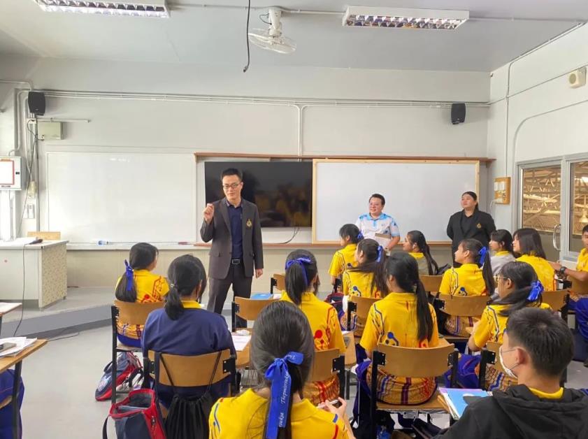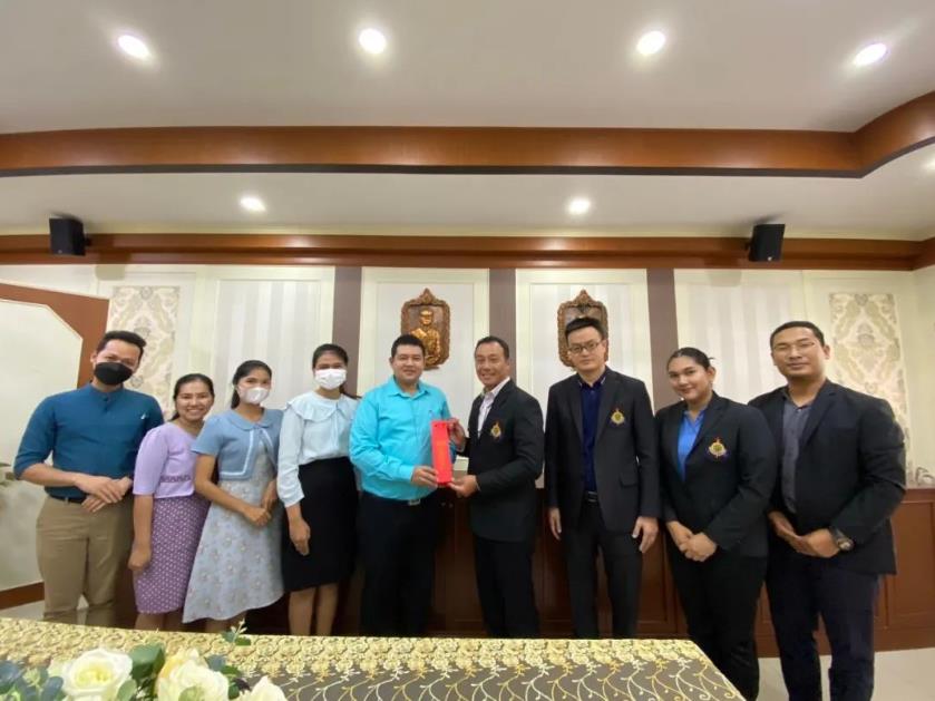 2023年9月22日上午,格乐大学副校长助理 Yingsak Sittirakorn 老师与中国国际语言文化学院院长罗勇博士,带领大学推广与学术交流合作部工作人员一行拜访了泰帕密中学校长参才(Chanchai Chunprasaeng),双方深入探讨了即将签署有关学术方面合作交流备忘录细则,互相交换纪念品以致谢,该校将大力支持派遣学生参加“数字时代交流汉语”培训项目。我校访问团参观了高中部汉语课堂,并且与泰帕密中学的学生们进行了交流与互动。