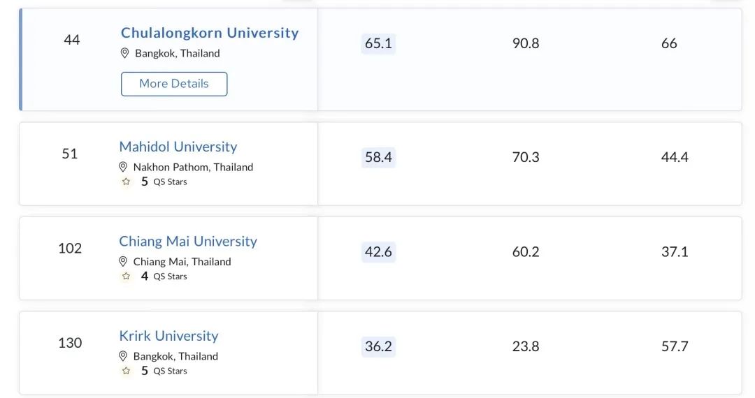 今年是有史以来规模最大的一次,共有来自25个国家和地区的856所院校参与。2024年度排名榜单中,泰国有4家高校进入QS亚洲名校榜单前130名,排名依次为朱拉隆功大学、玛希隆大学、清迈大学、泰国格乐大学。