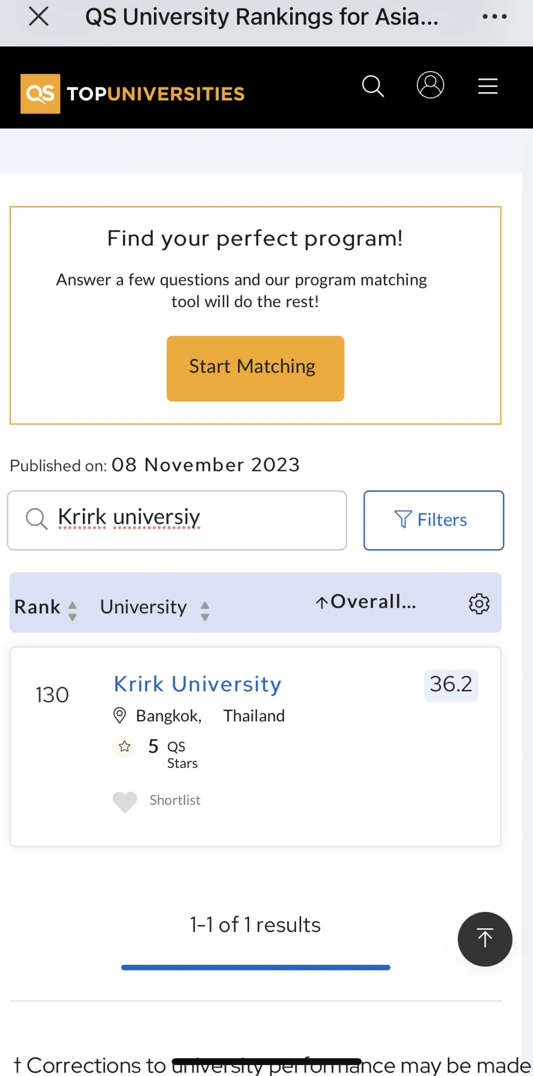 长按识别二维码,进入QS官方网址,在搜索框中 输入“Krirk university” 即可查询。